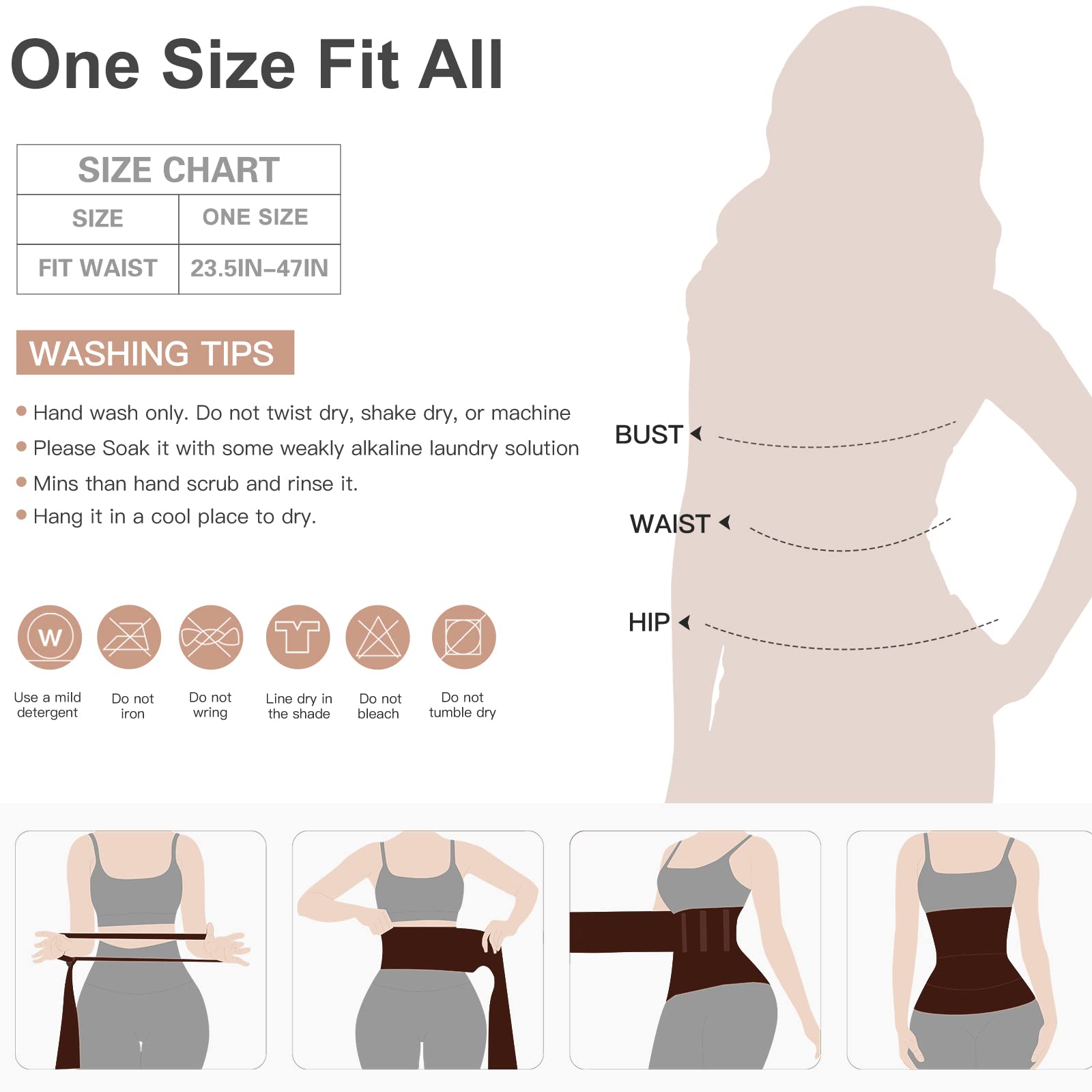 ONE SIZE FIT ALL WAIST TRAINER WRAPS:Waist trainer wrap is 13.1 ft long and 4.9inch wide, 5mm thickness. It has only one size, it can cover your whole tummy and stomach region and can fit most body types. Plus, our waist trainer wrap has passed over 10,000 times elastic tests, you will not need to worry about the quality. You can adjust the tightness according to your needs freely.