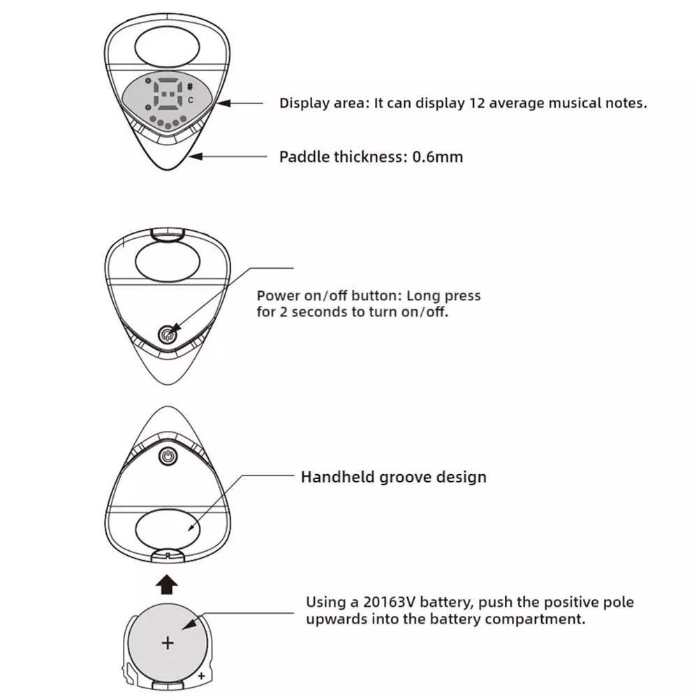 Convenient battery replacement design - Equipped with a CR2016 battery, this tuner is designed with a convenient battery replacement port. No additional tools or complicated steps are required. Users can quickly replace the battery by simply opening the battery compartment. Long-lasting battery life ensures that the tuner can accompany you for longer guitar playing.
