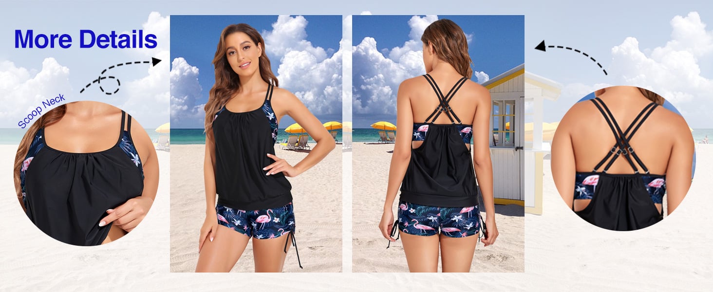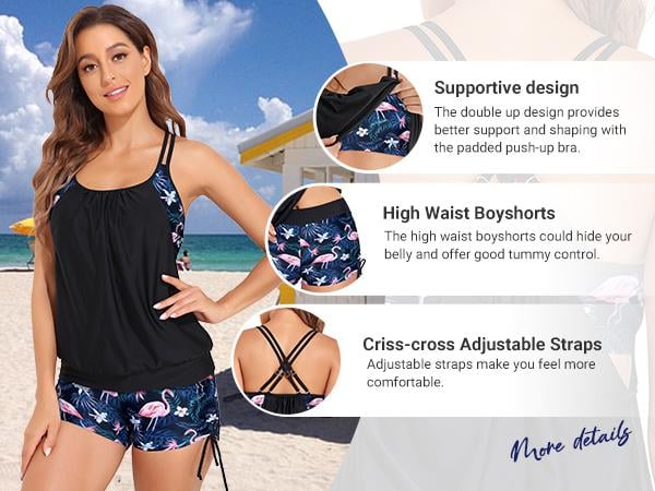 The blouson-style tankini top is designed to stay in place without floating, offering a flattering silhouette. Paired with high-waisted boyshorts that gently hug your midsection, this set offers excellent tummy control and coverage.