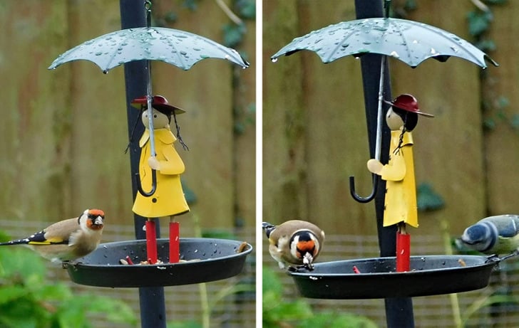 Forecast calling for rain No worries for hungry birds: this little weather girl holds her wide-top umbrella high over a deep basin to keep seed nice and dry. Under her charming slicker and boots are holes that drain unwanted moisture from the dish.