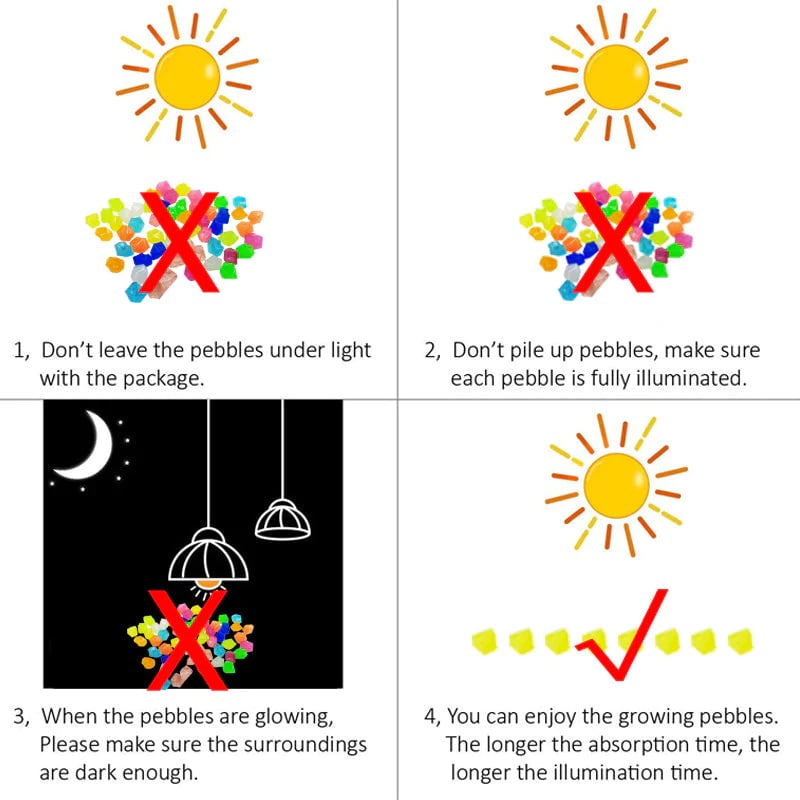 【300PCS Multicolor Glow】These glowing stones pebbles, 300PCS per bag, glow lasts about 3-4 hours in the dark after direct sunlight about 30 minutes. The intensity of the glow will dissipate gradually.