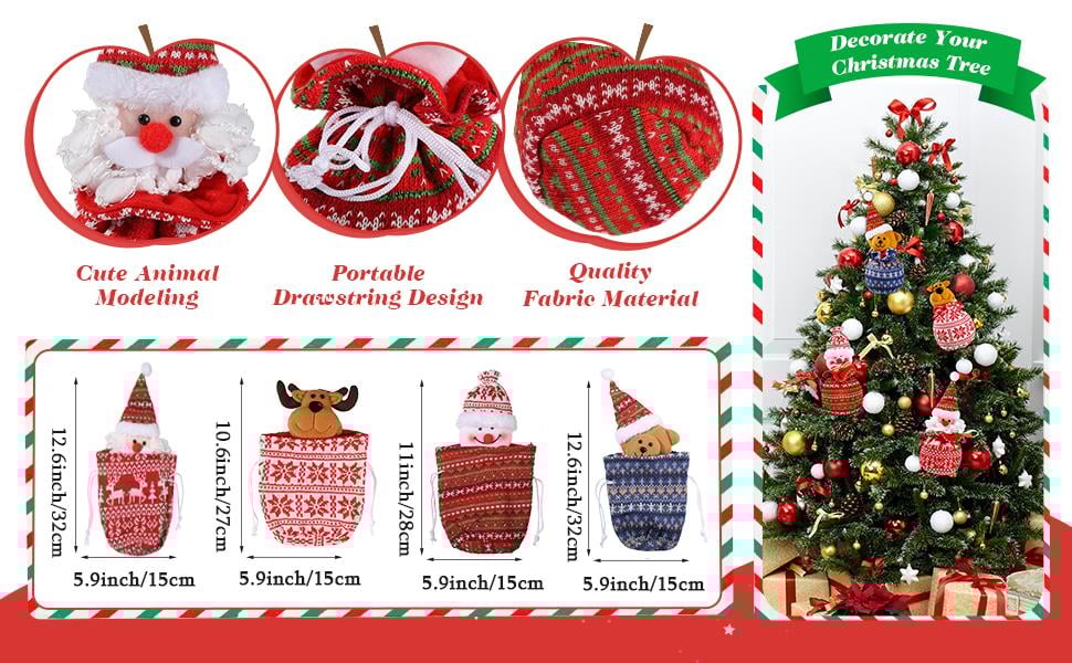 The size of this bag is perfect for Christmas gifts, party gifts, candy, apples, and Christmas tree decorations.