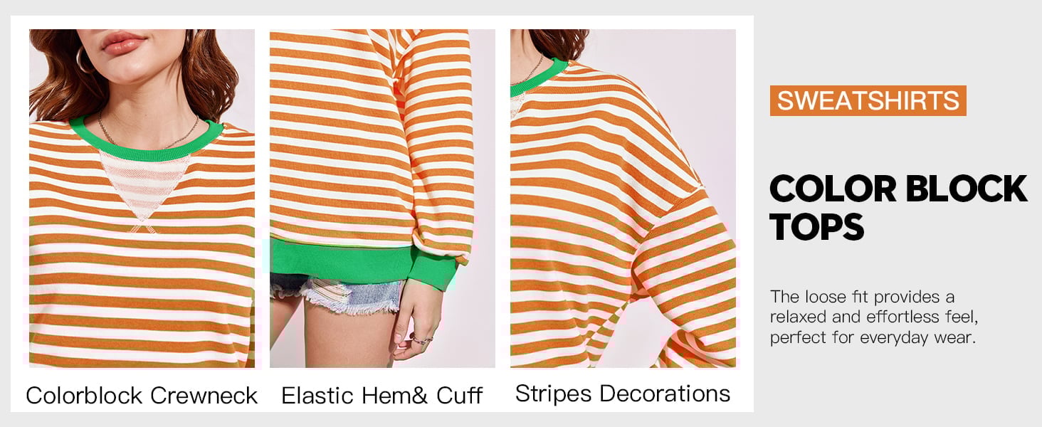 • Features: Color block striped sweatshirt for women girls, crew neck long sleeve drop shoulder shirt top, ribbed neck, cuffs and hem, loose fit. The unique stripe and multiple color contrast design, giving it a fun youthful vibe, quite trendy for y2k teen girls.