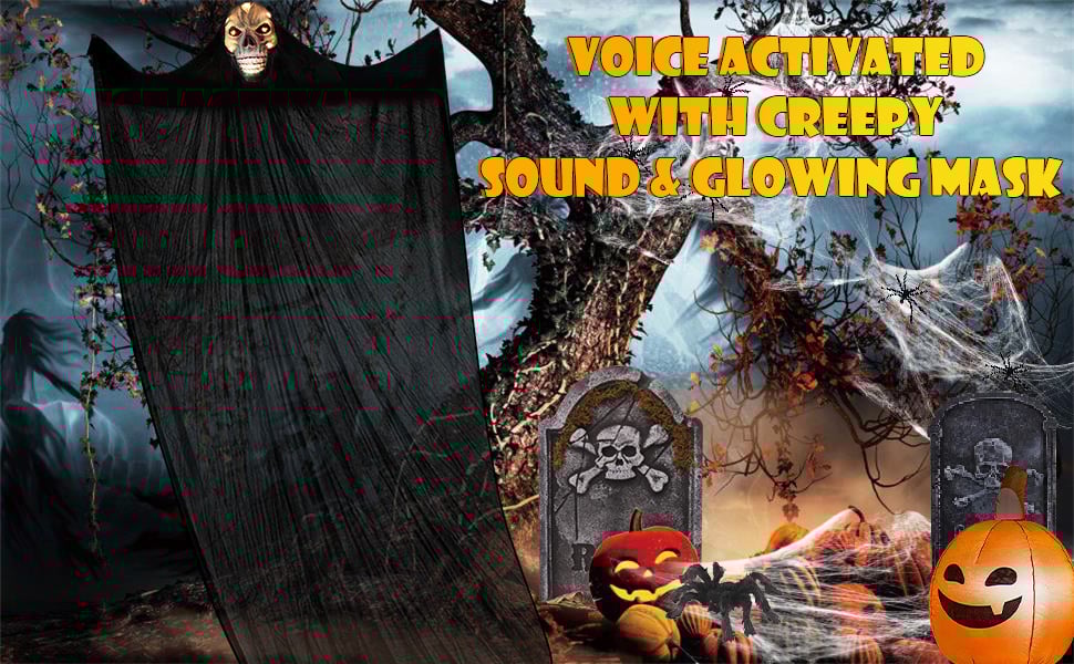 In the dark night, When some noise is made, the ghost mask will suddenly shine, with Scary Hanging Reaper Motion Voice Activated with Creepy Sound,to surprise or frighten the visiting guests unexpectedly, which they are ideal for hanging in dark corners around your house to spook your unsuspecting guests!