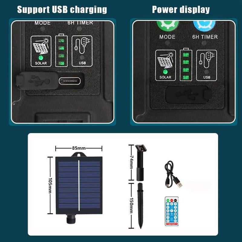 Compared with traditional solar panels, added four new functions: ①USB charging port ②power display ③mode display ④Remote control receiver. Allows you to clearly know your lighting settings. After full charging, our solar garden lights can work up to 15-20 hours after full charged.