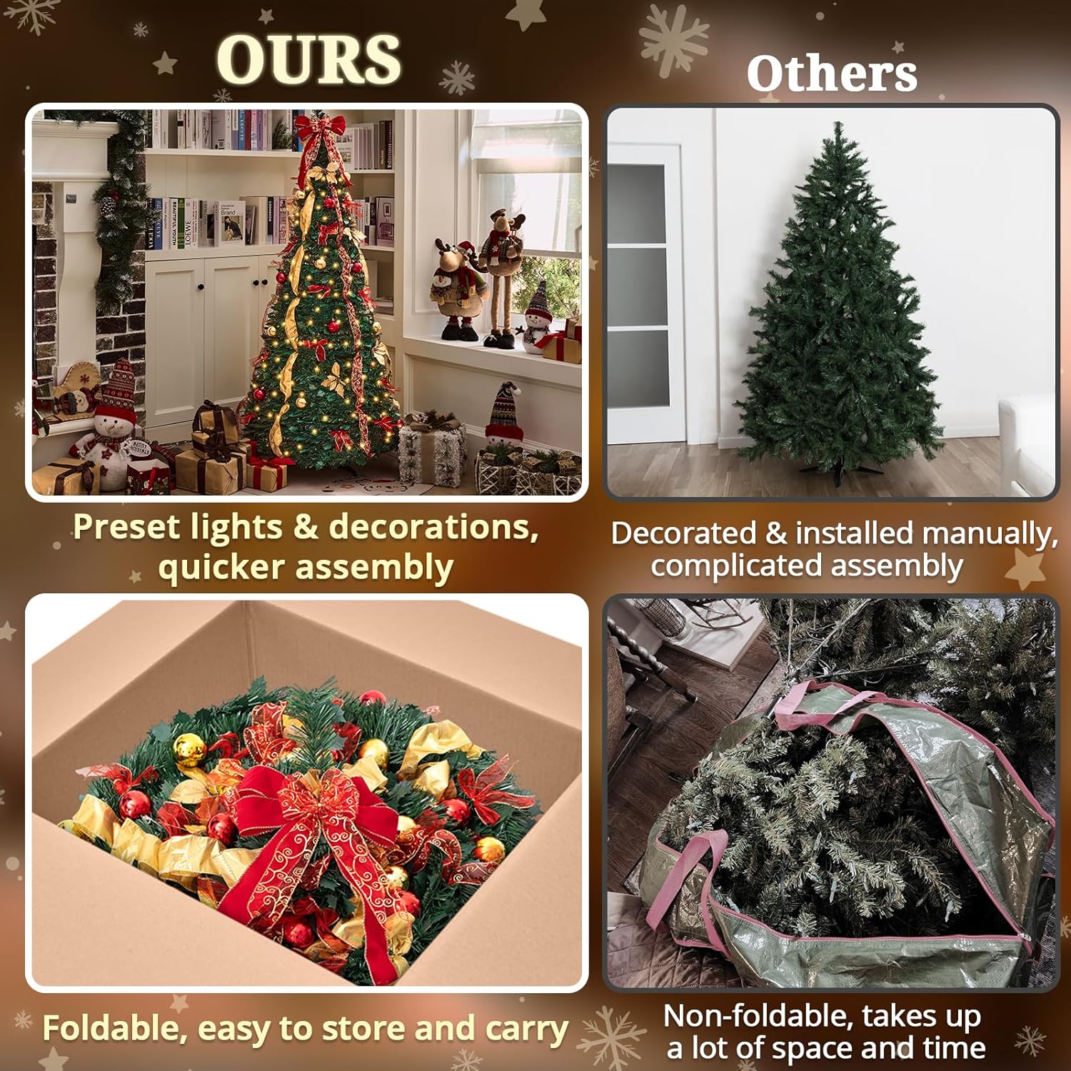 Forget the hassle of traditional tree setup. With the Folding Christmas Tree Decoration, simply unpack, place it on the stand, pull it up, and plug it in. Your stunning holiday centerpiece is ready in moments, saving you time and effort.