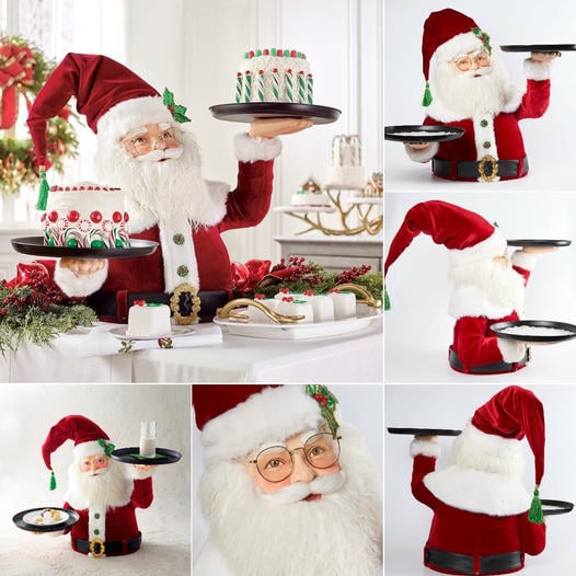 🎅🎅He has a fluffy white beard and a smiling face with brown eyes peering out from metal rimmed glasses! His hat is long accented with a green tassel and a holly leaf! In each hand he holds up a tray perfect to place cupcakes, treats, or even champagne glasses!