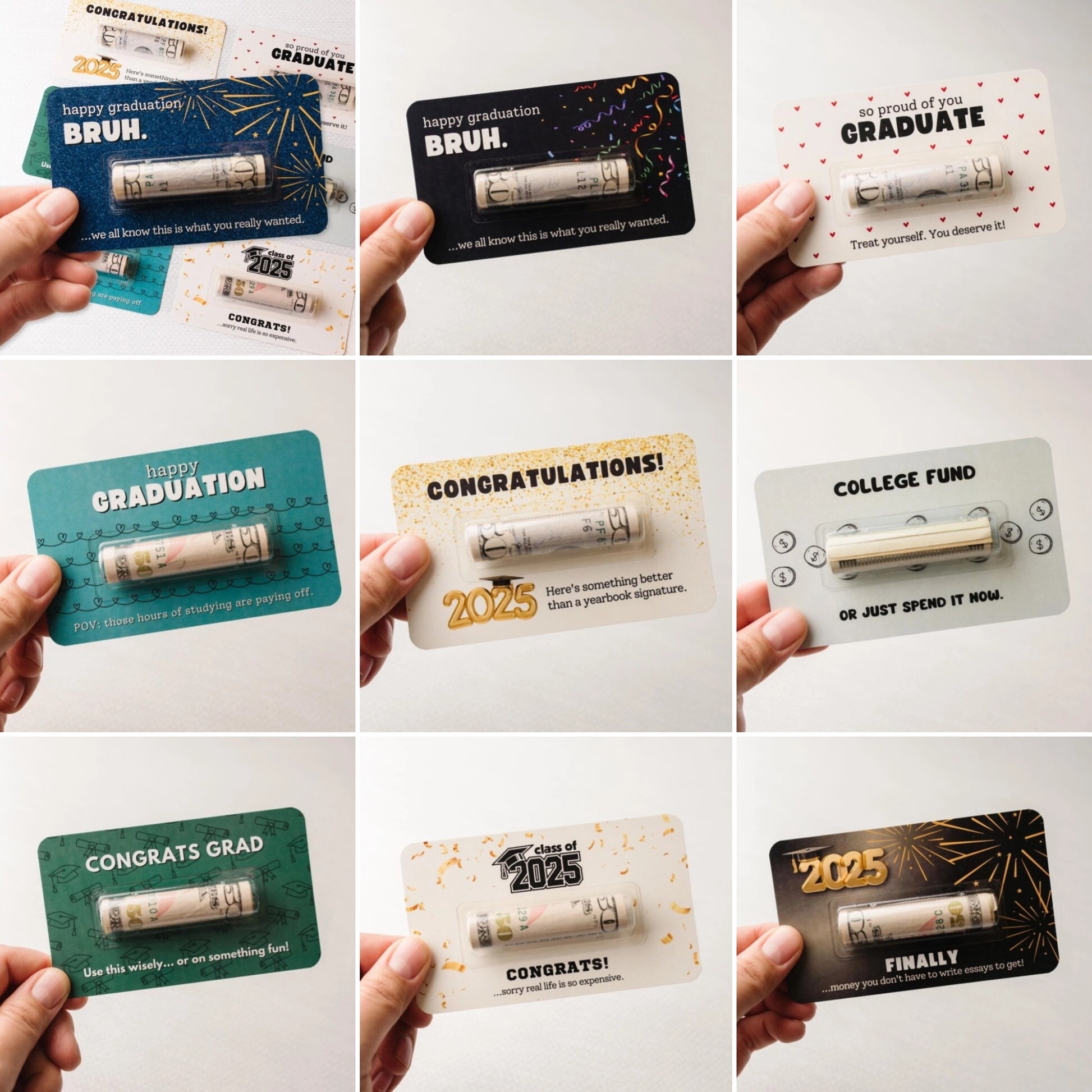 These money cards are a fun way to elevate a simple cash gift for a graduating senior. Be the cleverest aunt, uncle, grandparent, or supportive friend, and gift them something they'll use AND remember!
