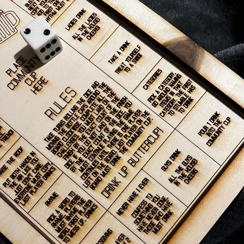 - Engaging and Interactive: Each player rolls two dice in turn and accepts punishment according to the wooden board prompts.Until everyone fell to the ground drunk. This dynamic keeps everyone involved and adds an element of surprise to each turn.
