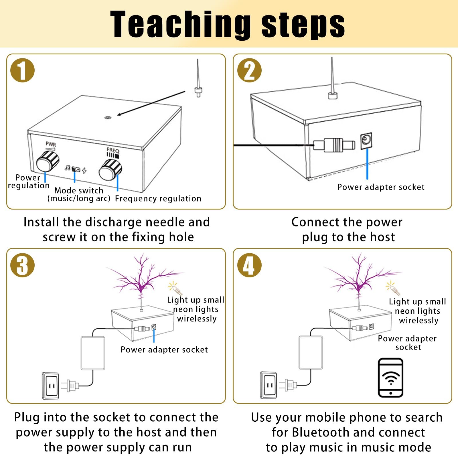 Long Arc Mode & Music Mode: Long arc mode and music mode: Long arc mode releases lightning at a fixed frequency. When the knob is turned to medium power, the lightning can be touched, and you will only feel a little tingling. Music mode: Connect to the device via Bluetooth, it can play square wave music, and lightning energy is concentrated in the cluster. You can see the arc of Tesla coil beating to the music, it will present an amazing sparkling melody.