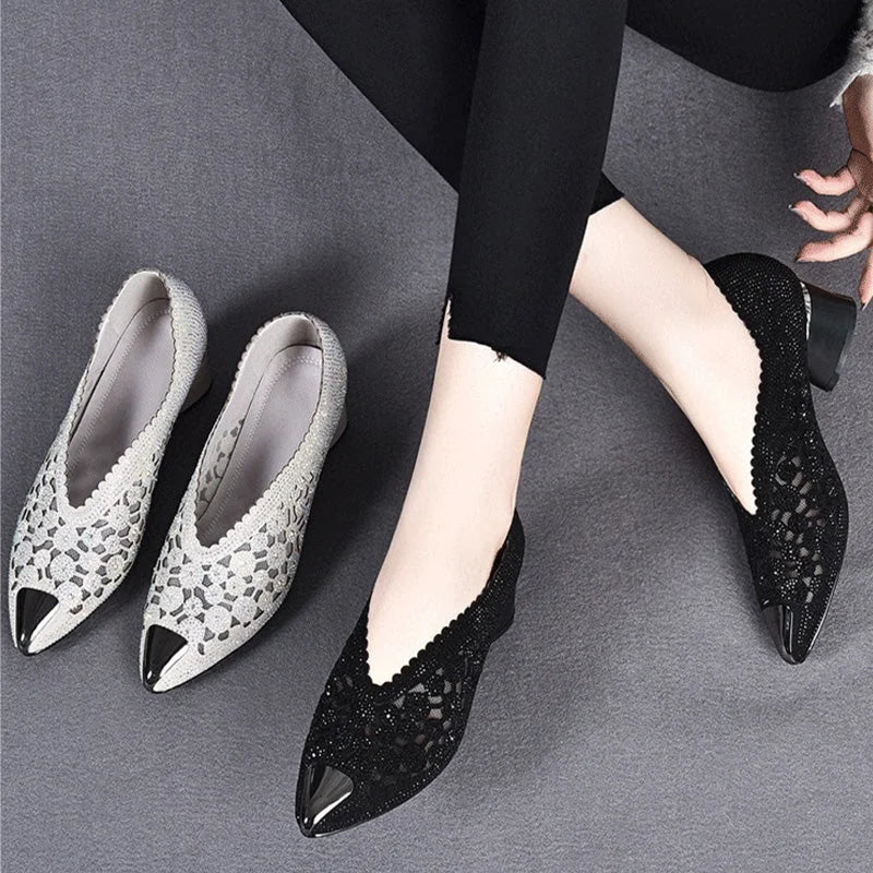 Step into glamorous comfort! Make a bold fashion statement with our hollow mesh sandals with rhinestone and chunky heel.