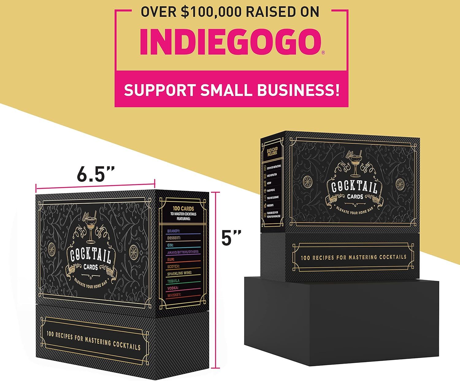 PACKAGE INCLUDES: (103) Flashcards (6.5"x5") in size. 100 Cocktail Cards + 1 Index Card, 1 instructional card, and 1 introductory card. Box to hold the cards