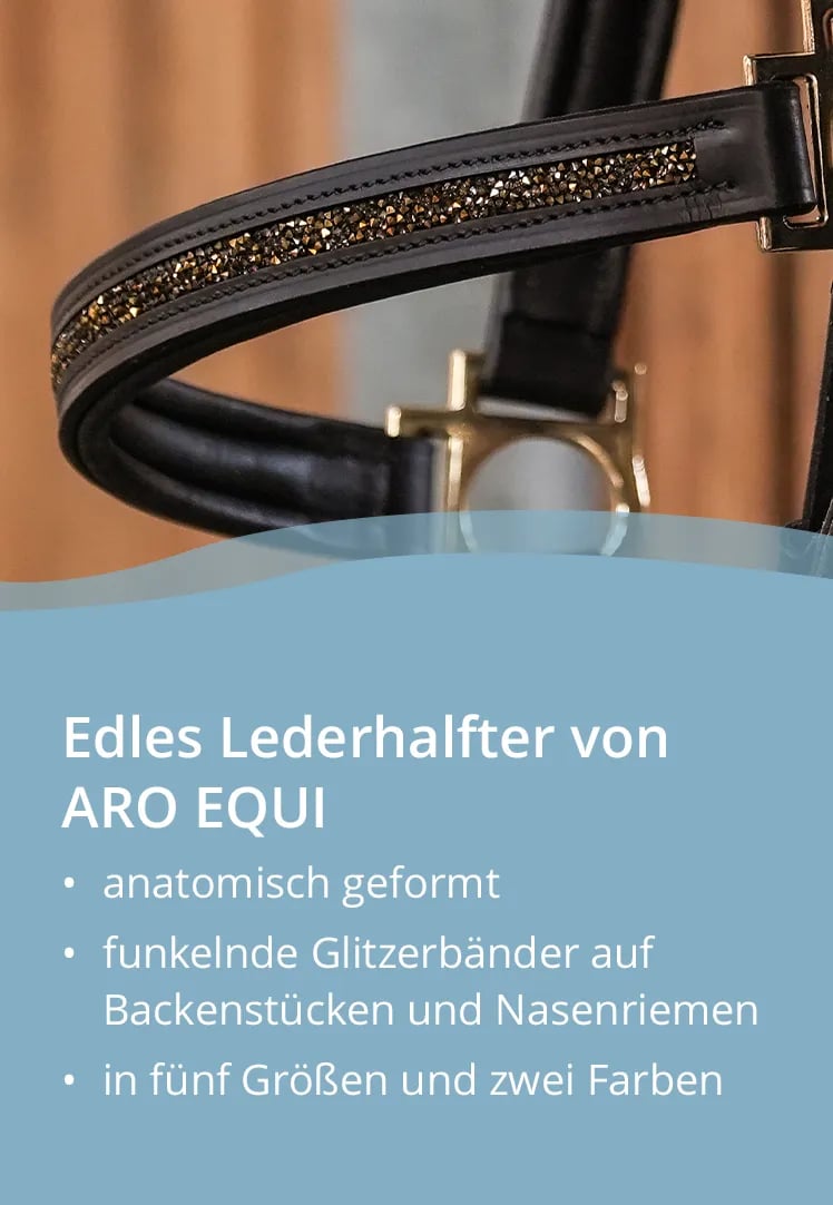 This year's highlight is a beautiful anatomical leather halter from ARO EQUI. The cheek pieces and noseband of the halter are decorated with precious, sparkling glittering ribbons. Limited Edition!.