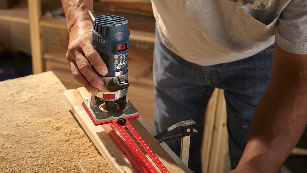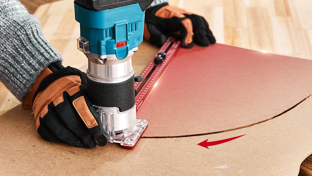 4. Stick the guiding rule closely to the side of the board, and then slide the bracket and the trimming machine in parallel to make smooth grooving.