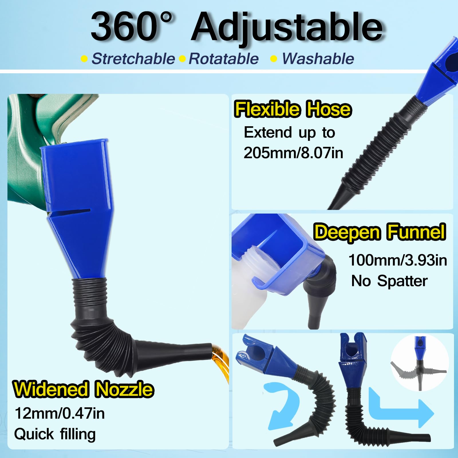 It has a more elastic flexible hose, and is easy to stretch and shape, which is more convenient for our daily use of adding water and pouring oil. The threaded bayonet design enables the hose to adhere tightly to the funnel, and the liquid will not leak during pouring.
