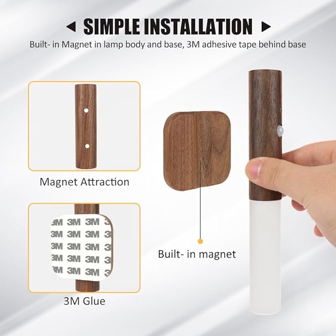 Flexible and Convenient Installation: No Tools Required. Our Sensor Light can be easily installed without hard wiring or drilling. Simply use the 3M rubber pad to stick the base onto any smooth surface and use the built-in magnet on the handle to attach it to any iron surface, such as a refrigerator or stair railing.