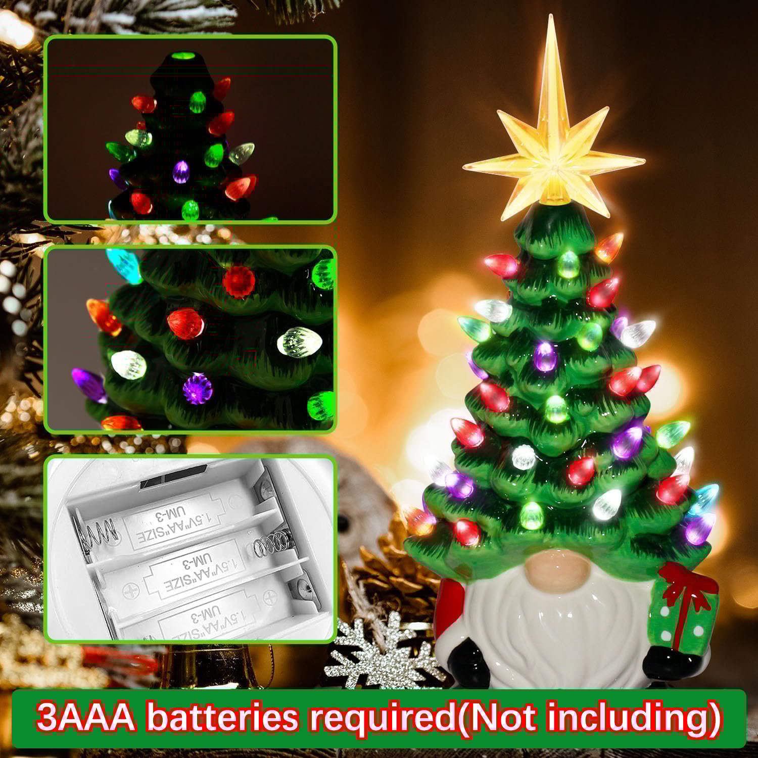 🎄🎄The tree decorations have about 46 colorful lights and a seven-pointed star on the top, which are the hats of a cute gnome!