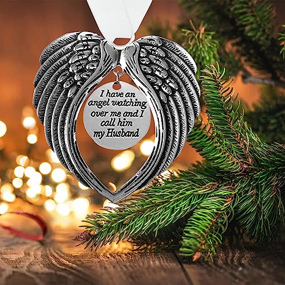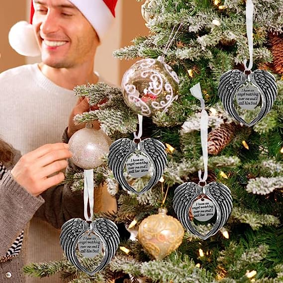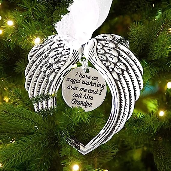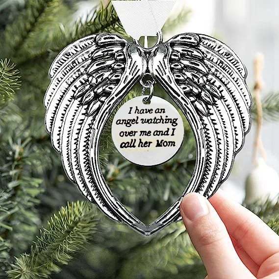 It's an angel wing stainless steel charm with the "I have an angel in heaven" charm and an antique silver family member's heart charm, your choice. Ornament hangs from white organza ribbon. Make a beautiful memorial for your lost loved one.