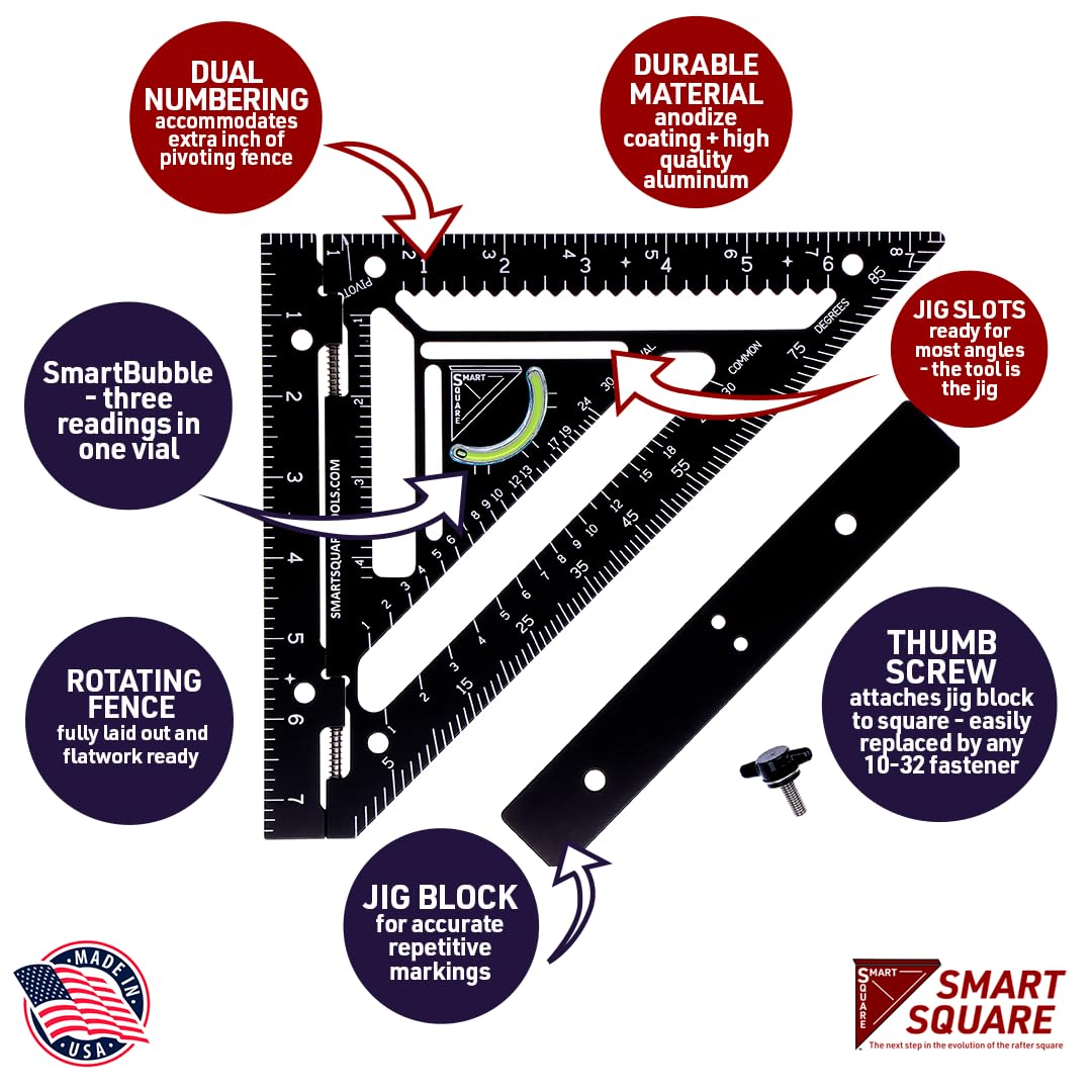 Use our exclusive jig block and thumb screw to turn the speed square into a jig! Set the jig to any mark and lock in place. For reliable repetitive markings to save you time and money on the job site. Worth the price of admission alone