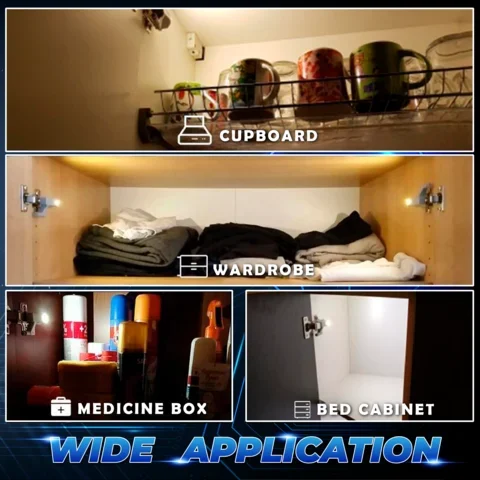 • Easy to install and convenient to use, after installing it on your cabinet hinge with battery,Ā when opening the cabinet, the lamp will turn on automatically. When closing the cabinet, the light turns off.