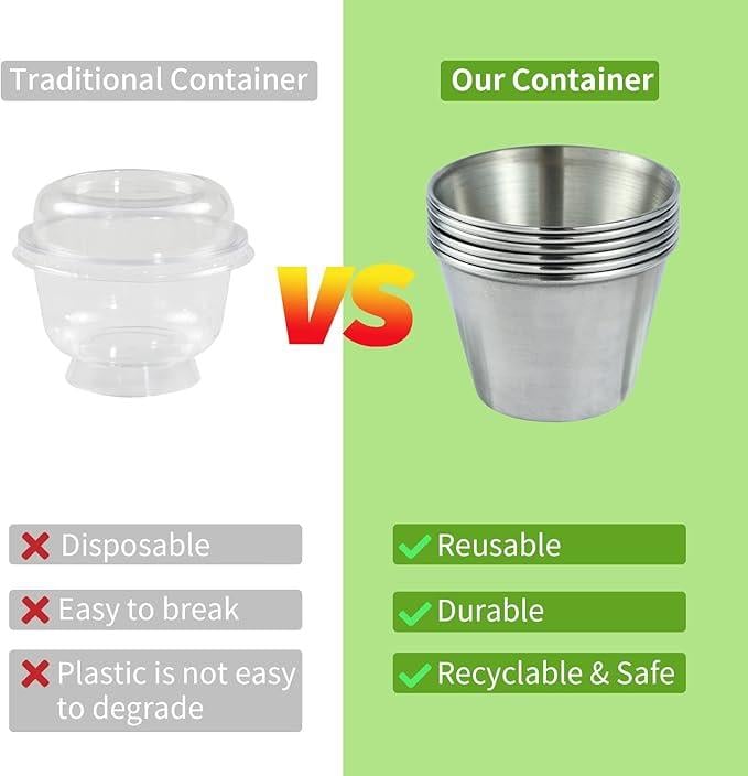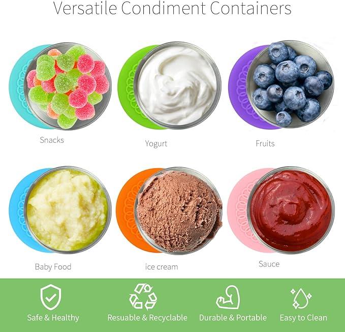 🍲【Durable and Safe】: Small stainless steel food storage containers are made of durable silicone and 304 stainless steel, reusable, not easy to break, cleaner, and safer. These dipping sauce cups have a certain capacity to help you control the sauce portion and maintain reasonable and healthy eating habits.