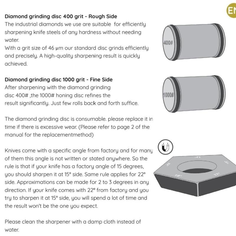 Widely Used: The knife sharpening kit is deceptively simple, but also surprisingly functional. ideal for fine-cutting work such as sushi, sashimi, Damascus knives, and particularly hard steels with a high carbon content. Simply select the angle and use a magnetic tool holder to secure the blade. Then roll the knife back and forth until the blade is sharp. Finally, use a smoother disc on the other end to polish the edges.