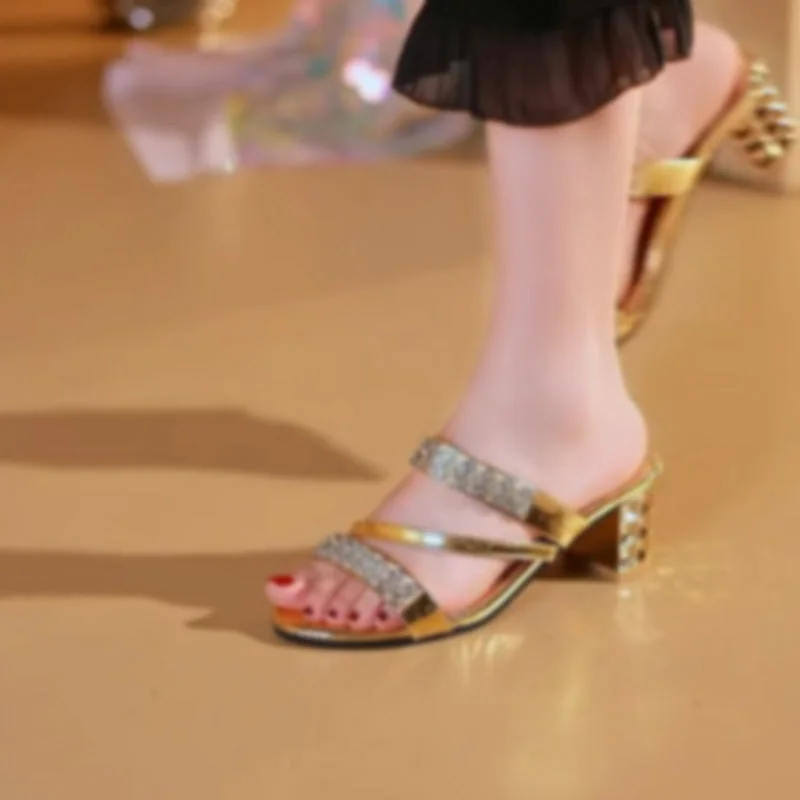 SECURE AND STYLISH STRAPS: A combination of wide rhinestone-studded straps and a sleek metallic band ensures a snug yet flexible fit. These open-toe sandals keep your feet in place while allowing natural movement and breathability.
