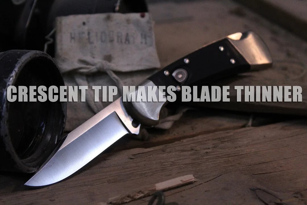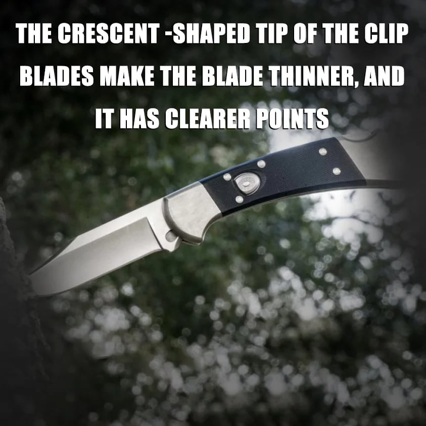 The crescent tip of a clip point blade makes the blade thinner with a sharper point. This shape provides good control for detail work and cutting in tight places. It is also well suited for intentional punctures like new holes in your belt, etc. While the point of the blade is effective for detail work, it's not as strong as the thicker points on drop points and skinners.