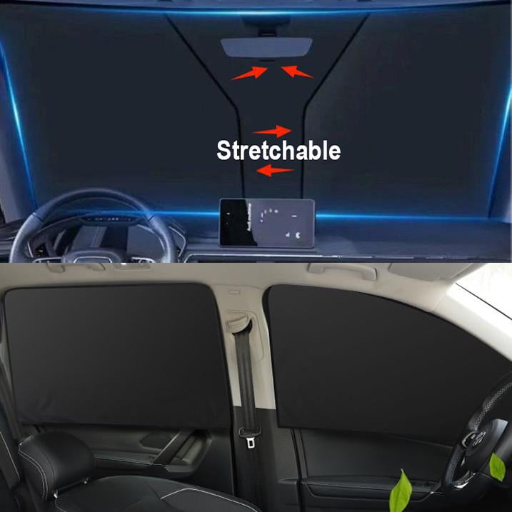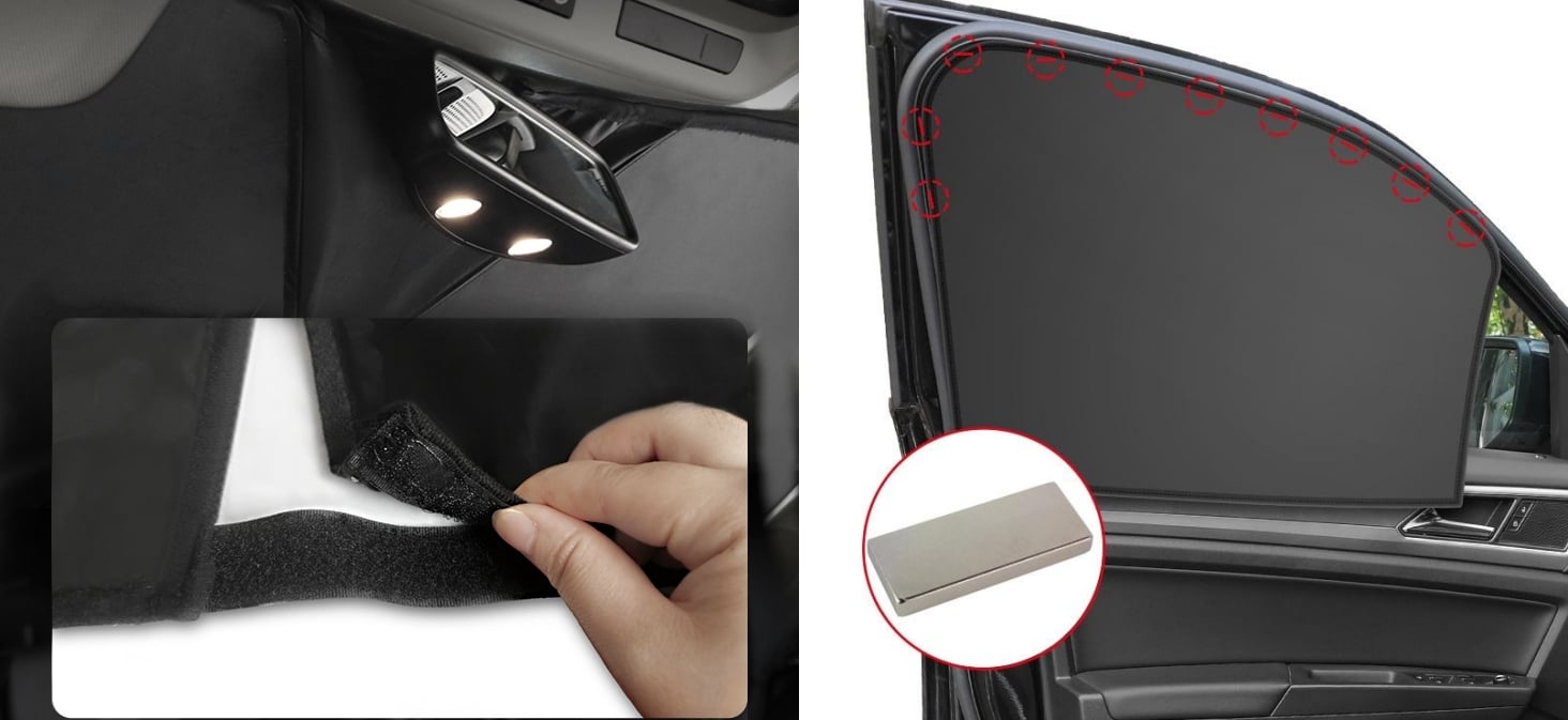 The edges of the shade cloth are equipped with magnets, allowing for a better and secure fit against the window. The strap in the middle of the front sun visor is adjustable to fit all models.