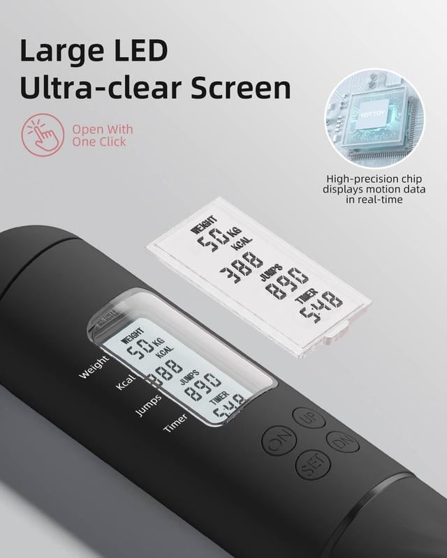 [LED display] The digital jump rope features an HD LED display that shows the Timer, Weight, Calories, and Circles. Set your weight and track time, number of jumps, and calories burned to achieve your fitness goals more effectively.