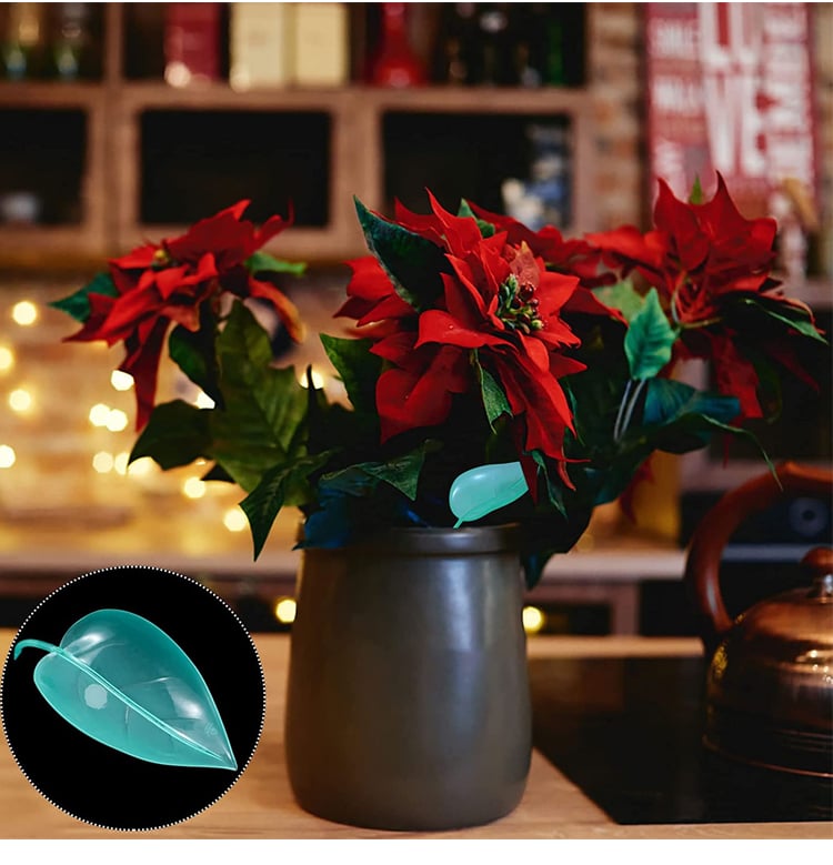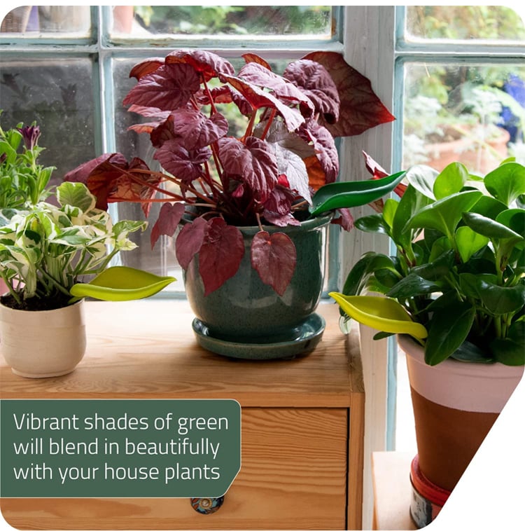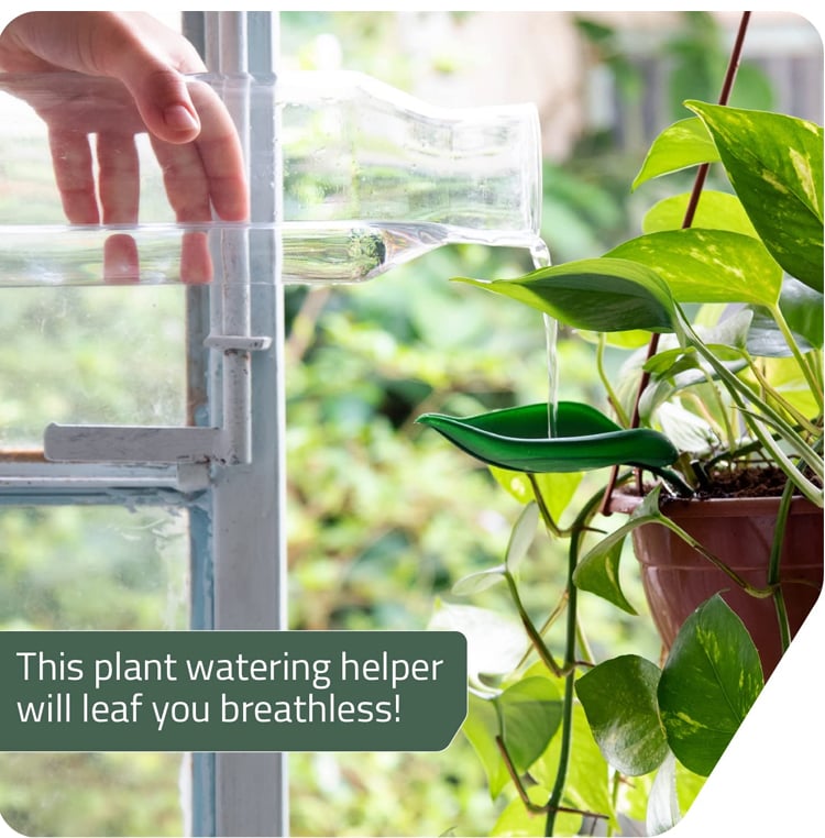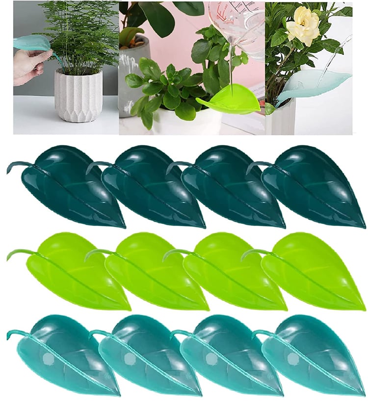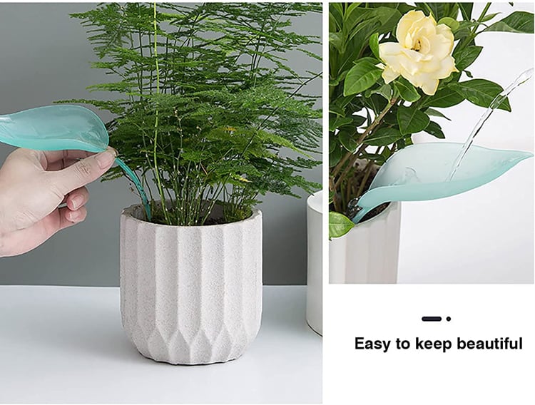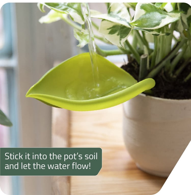 When inserted into any potted plant, the leaf blends into the foliage and acts as a grooved slide to channel water directly to the soil.