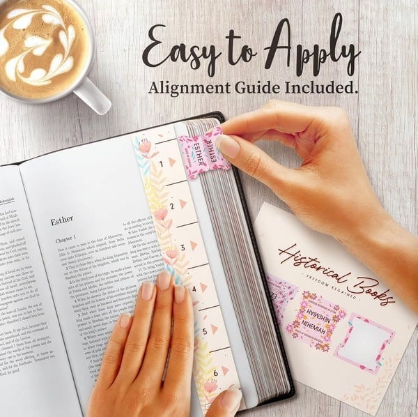 EASY, FAST ALIGNMENT GUIDE, large print Bible book tabs and summaries means you spend less time setting up and more time actually reading His word. Amazing Bible Index Tabs for women who journal by the books of the Bible.
