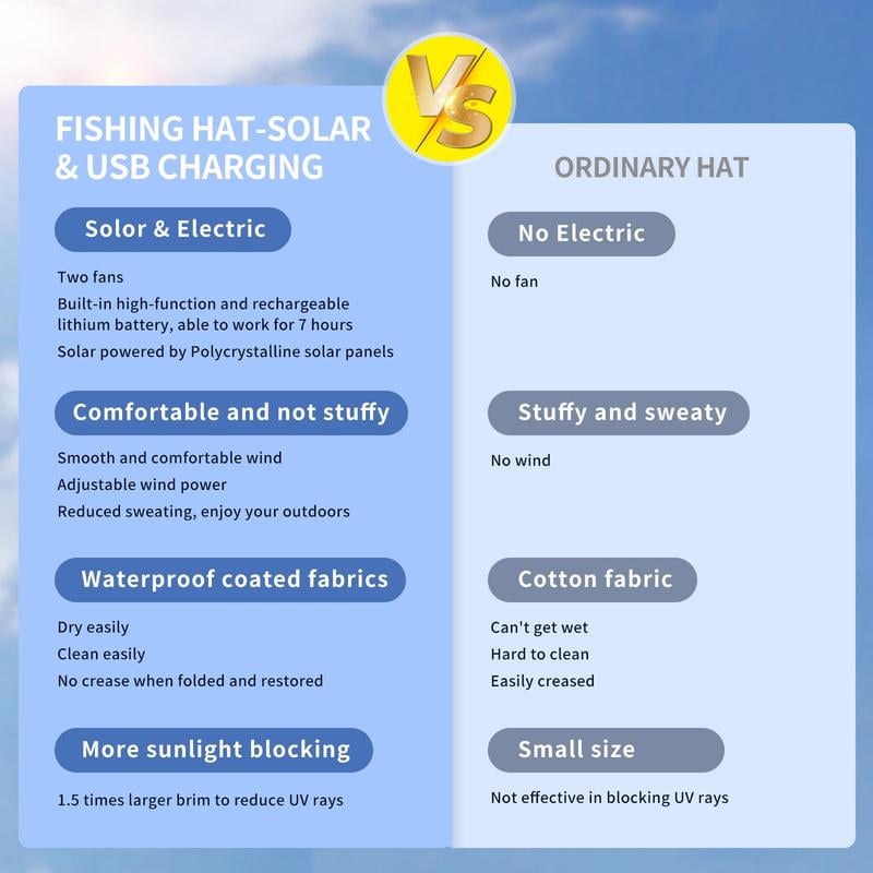 - USB Charging & Solar Powered: This men's fishing sun hat has two power modes, solar powered or USB charging. Charging for 3 hours can last up to 9 hours. The "SUM" mode is solar powered, which can last indefinitely in a light environment.