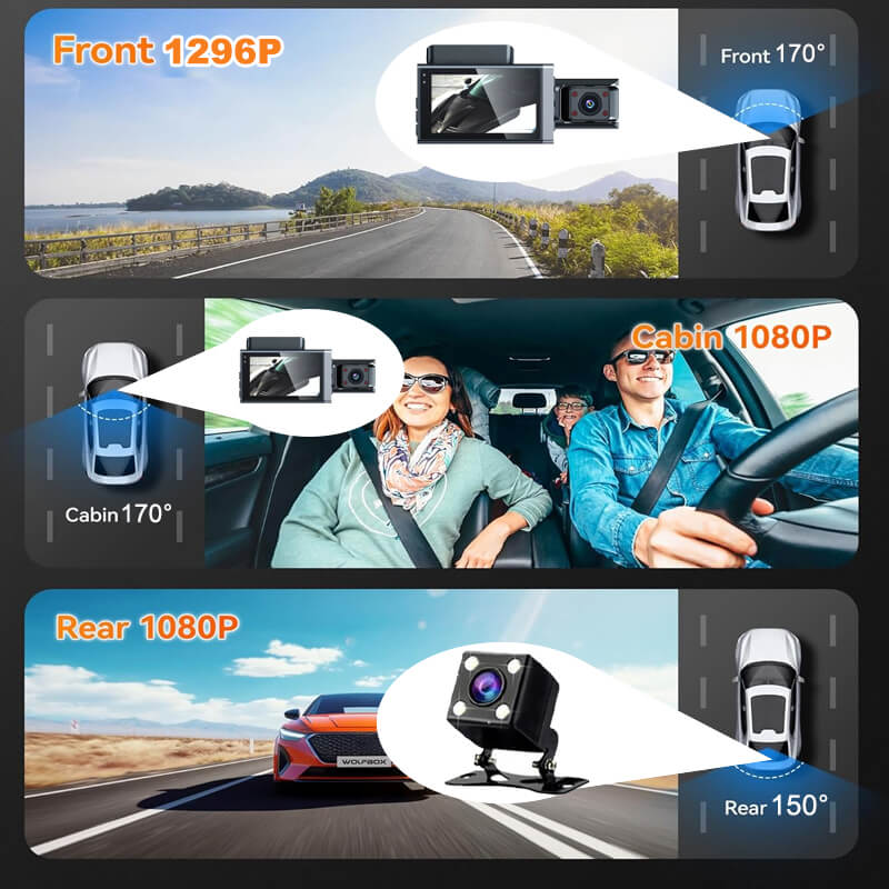 iToolMax innovative 3 channel dash cam, with front+interior+rear 3 channel, all-around view coverage, built-in wifi, 24 hours real-time monitoring and saving, protect your car safety.