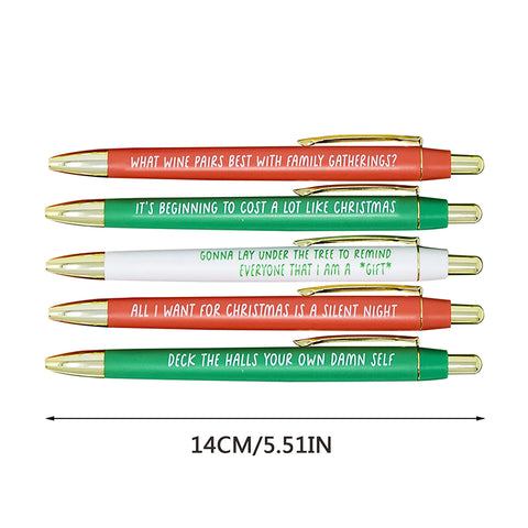 Set of 5 retractable ball point, clip pens. Chubby barrels are brightly colored: red, green and white. You'll winter wonderland how you ever managed without our Oh Shit, It's Christmas Pen Set!