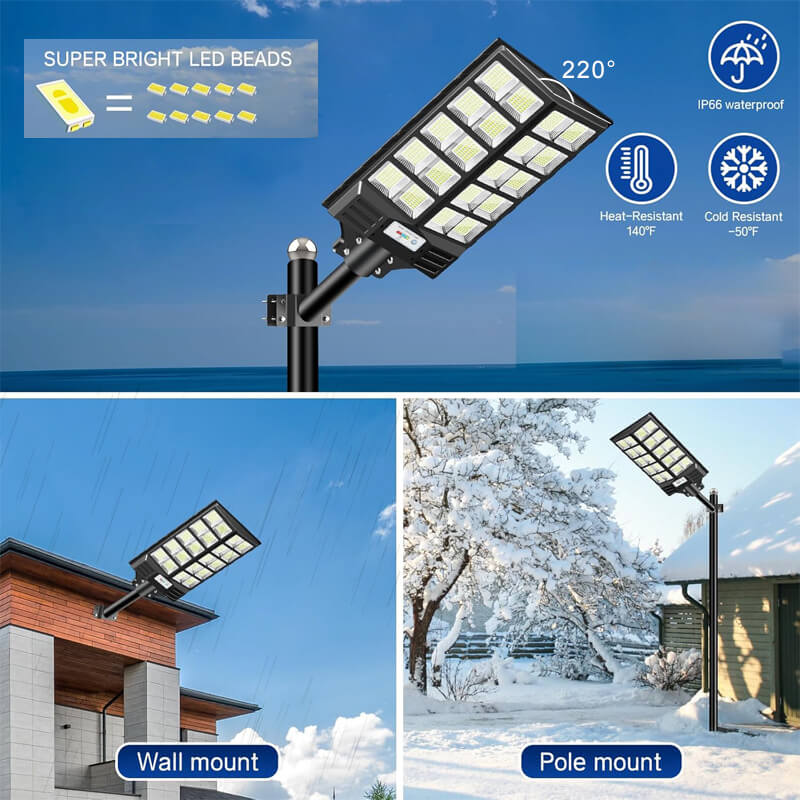 Upgraded 220° wide-angle design illuminates Max. 3400sq.ft(315㎡), best mounted height is 10-20ft(3-6m,wall/thick rod), no dark place. 100W imported high-brightness LED lamp beads, one is equivalent to 10 ordinary ones, and the brightness is increased by 14%. IPX67 waterproof for any bad weather, snowy, rainy and more, working under -50℉-140℉(-45.6-60℃)
