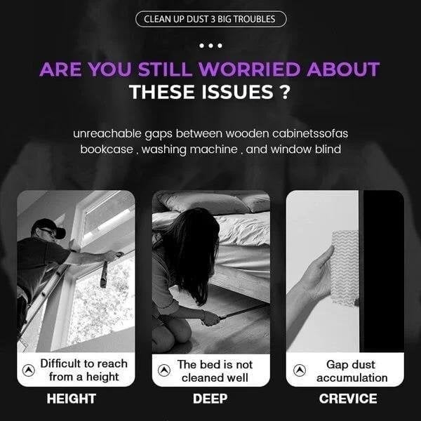 Easy to clean areas that are hard to reach, drive away dust with no effort at all. Widely use for unreachable gaps between wooden cabinets, sofas, bookcases, washing machines, and window blinds.