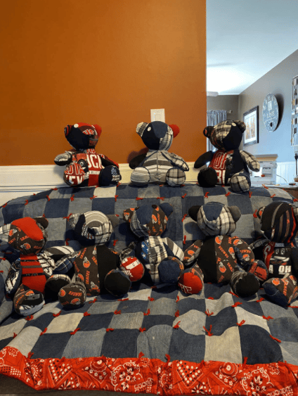 Memory Bear made from the clothing of a loved one who passed to help keep their memory alive. Can also be made from a child’s clothing to preserve their childhood memories. *Hand made using a huggable patterns templates.