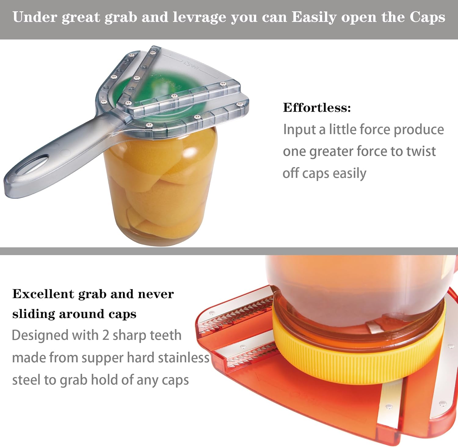 Easy effective:Sharp dual stainless steel teeth grip lid firmly, reducing force required to open jar,contoured non-slip handle for better leverage,allowing the opener to do the work rather than your hands and wrists.