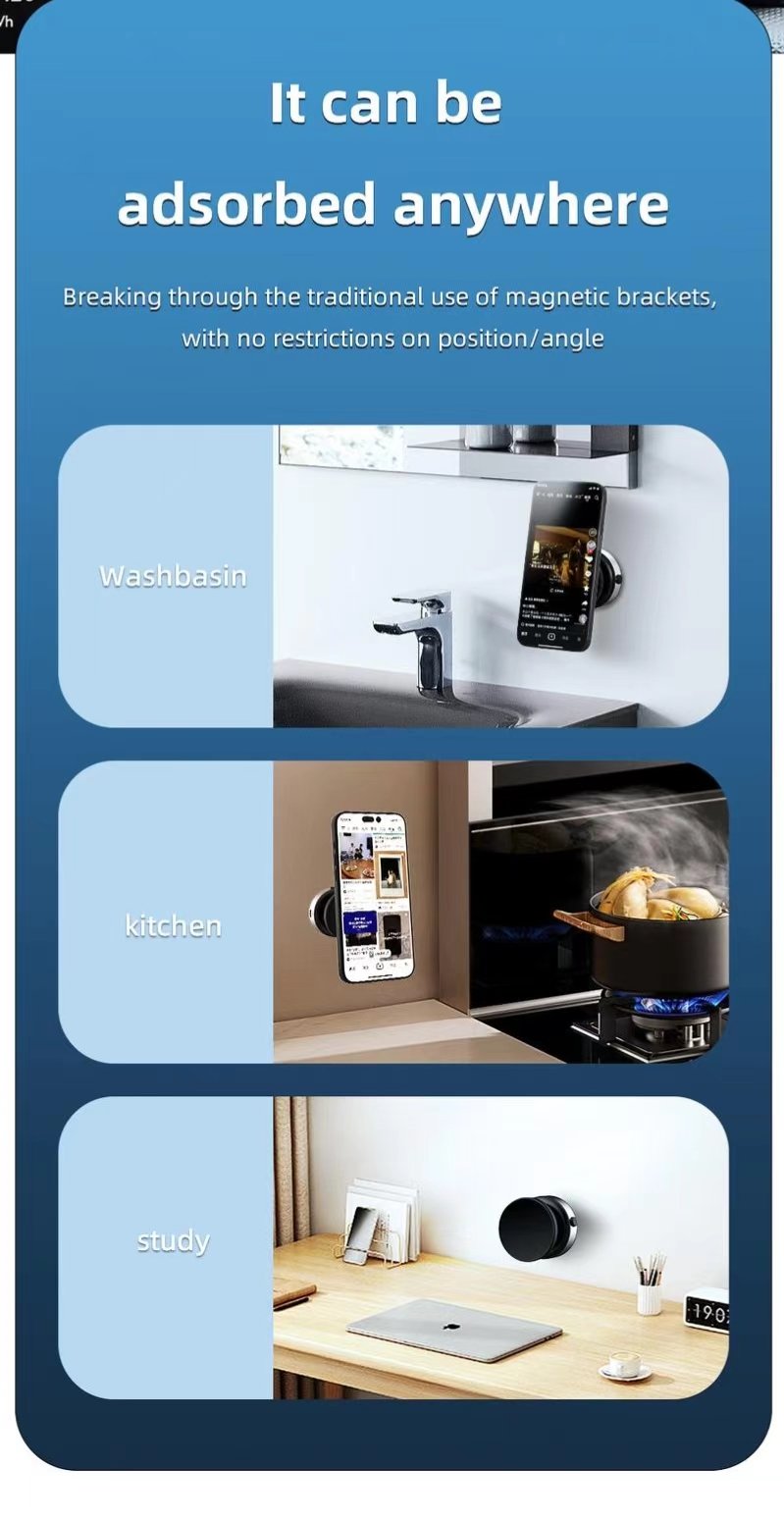 When using, press and hold the button to push towards the suction cup with force, let it stand for one second, and after the electronic device is tightly sucked, you can release your hand for use. When you need to remove the electronic device, press the middle button of the suction cup to easily remove it (be careful not to forcefully pull it out)