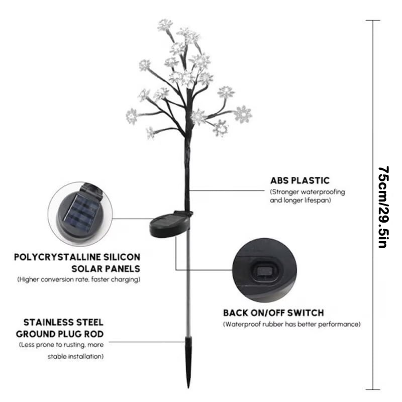 Our solar-powered flower lights with 20 LED cherry blossoms have higher brightness and more vivid colors. The upgraded wider solar panel converts sunlight into power faster and more efficiently to maximize lighting time. Great for creating a romantic atmosphere in your garden.