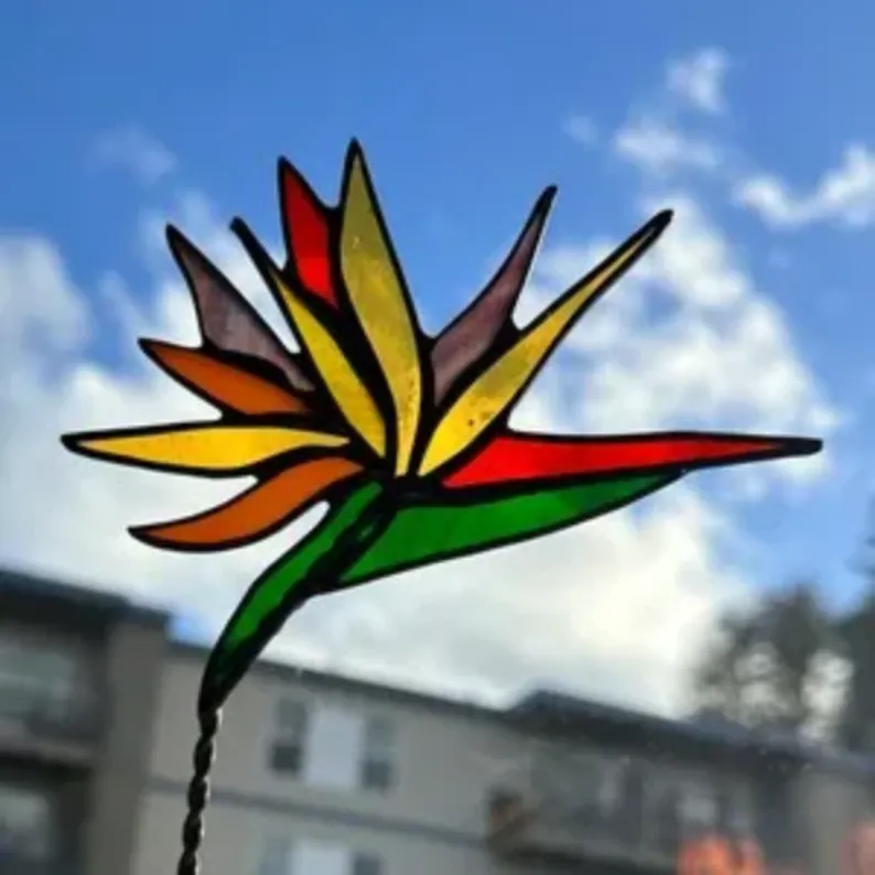 Plant stake Strelitzia exotic or bird of paradise bloom, unusual and bright decor for the garden or home flowers. Oddly enough, the meaning of this flower coincides with its appearance, unusualness and brightness.