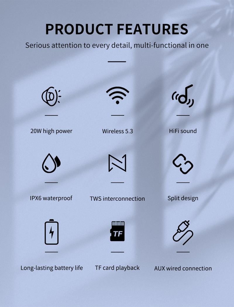 The speaker is equipped with features such as true wireless stereo interconnection for stereo sound, IPX6 waterproof rating for outdoor use, and supports various music playback modes including AUX wired input and wireless.