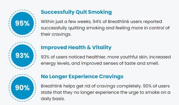 Breathlink helps reduce cravings significantly, with 90% of users stating they no longer experience the urge to smoke daily.
