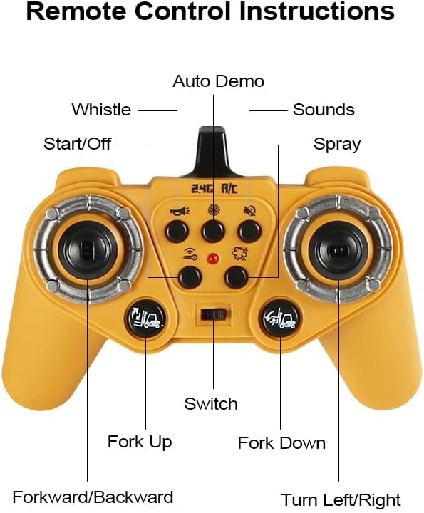 11 Channel RC Forklift: Forklift can go forward & backward, turn left & right, forklift pallet up & down, simulation sounds & lights, spraying, one key demo.