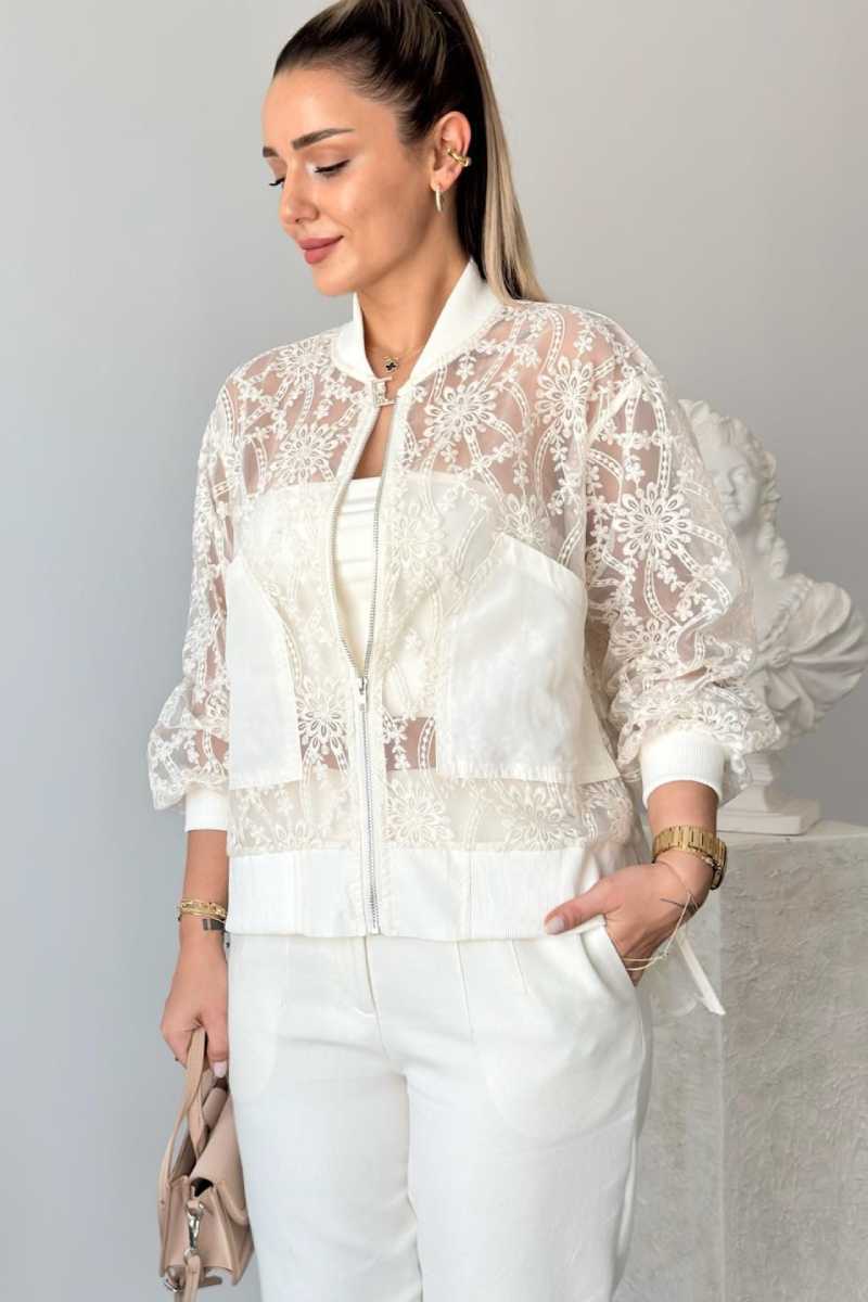 Romantic Sheer Lace Bomber Jacket with Balloon Sleeves