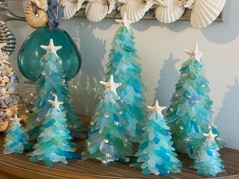 The sea glass Christmas tree is made of pure blue, green, and turquoise resin(Imitation sea glass). You can choose to place decorations on the tree decorated with seashells and mini starfish.
