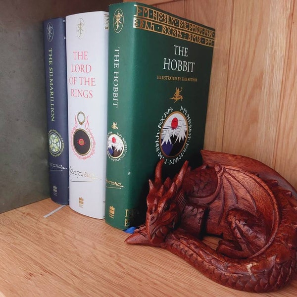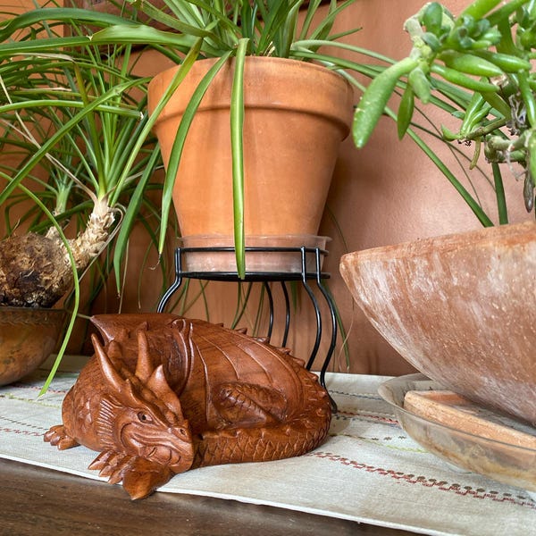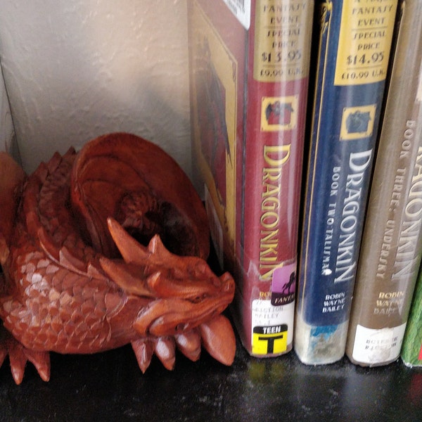 Small hand carved dragon, made from Jempinis wood then sanded and polished to rich warm finish with a soft beeswax polish. It measures from tip to tail 16cm and comes house trained and well fed!
