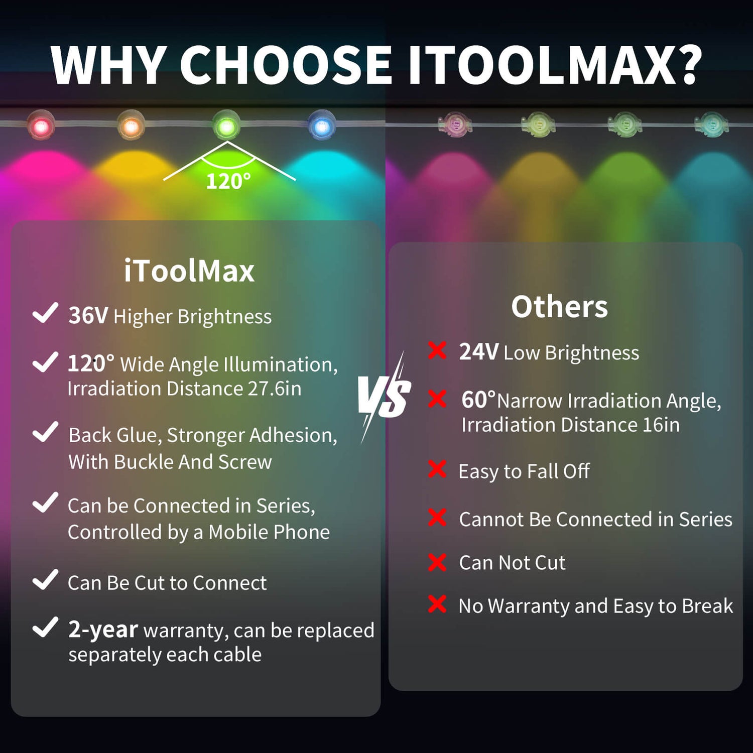 The lens design reveals elegant Fan-shaped lighting. Equipped with 72pcs LED 36V lights of 100ft rather than others 24V, each light is 30 lumens, much brighter. Mount the lights 2"-4" away from the wall to get the best wall-washing effect. The washing depth is over 16" to get the right light where you want.