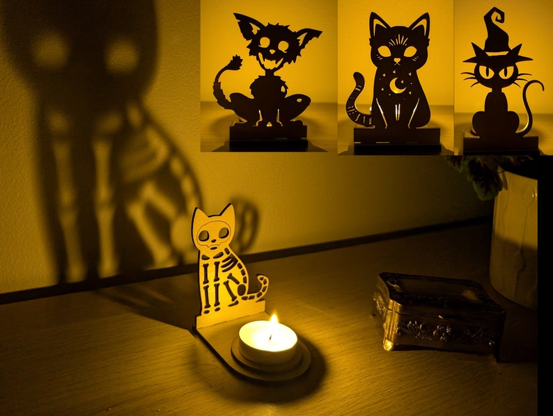 Elevate your Halloween decor with this adorable yet eerie glow-in-the-dark skeleton cat tealight holder. This unique piece creates a captivating shadow effect, making it a standout decoration that will surely scare (or delight) your guests!